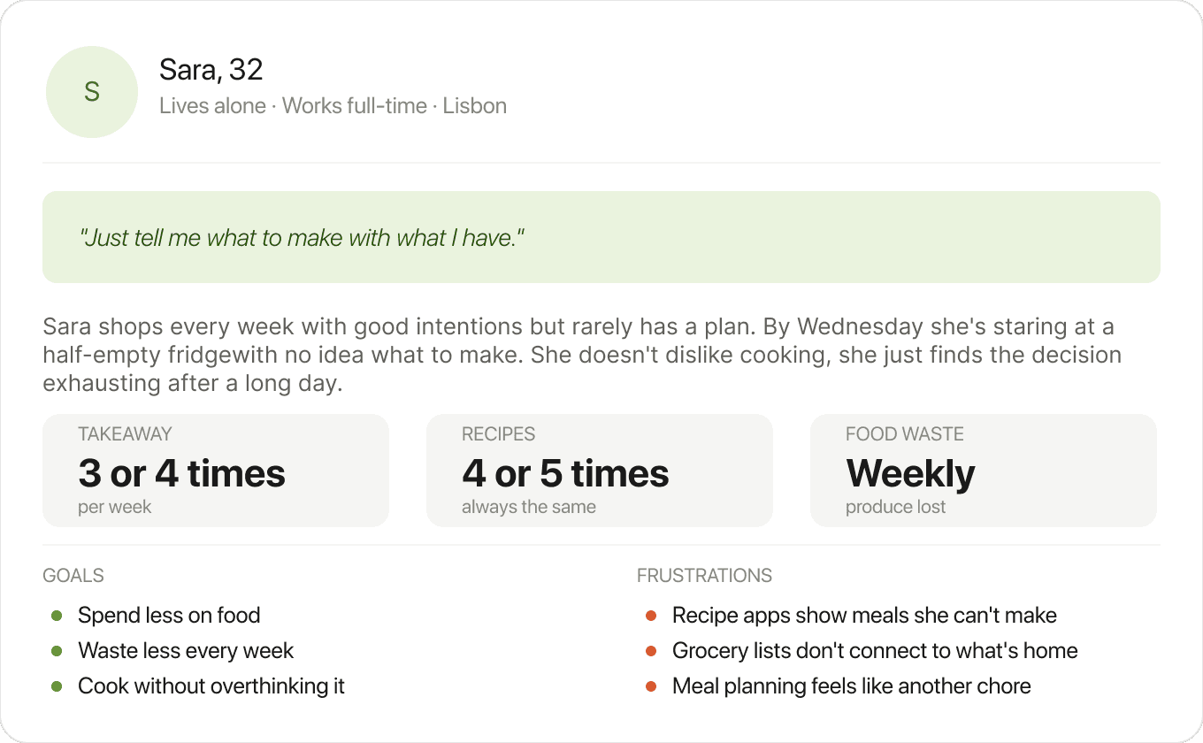 Without formal user interviews, the research started closer to home. Personal experience with the same recurring problem: a full fridge, no plan, and takeaway as the default.
