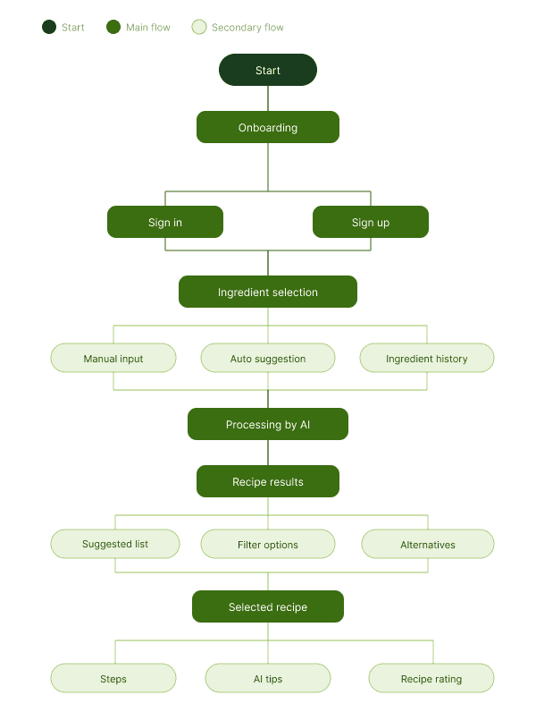 With the user defined, the next step was mapping her journey through the app: from the moment she opens the fridge and has no idea what to cook, to finding a recipe and knowing exactly what she's missing.