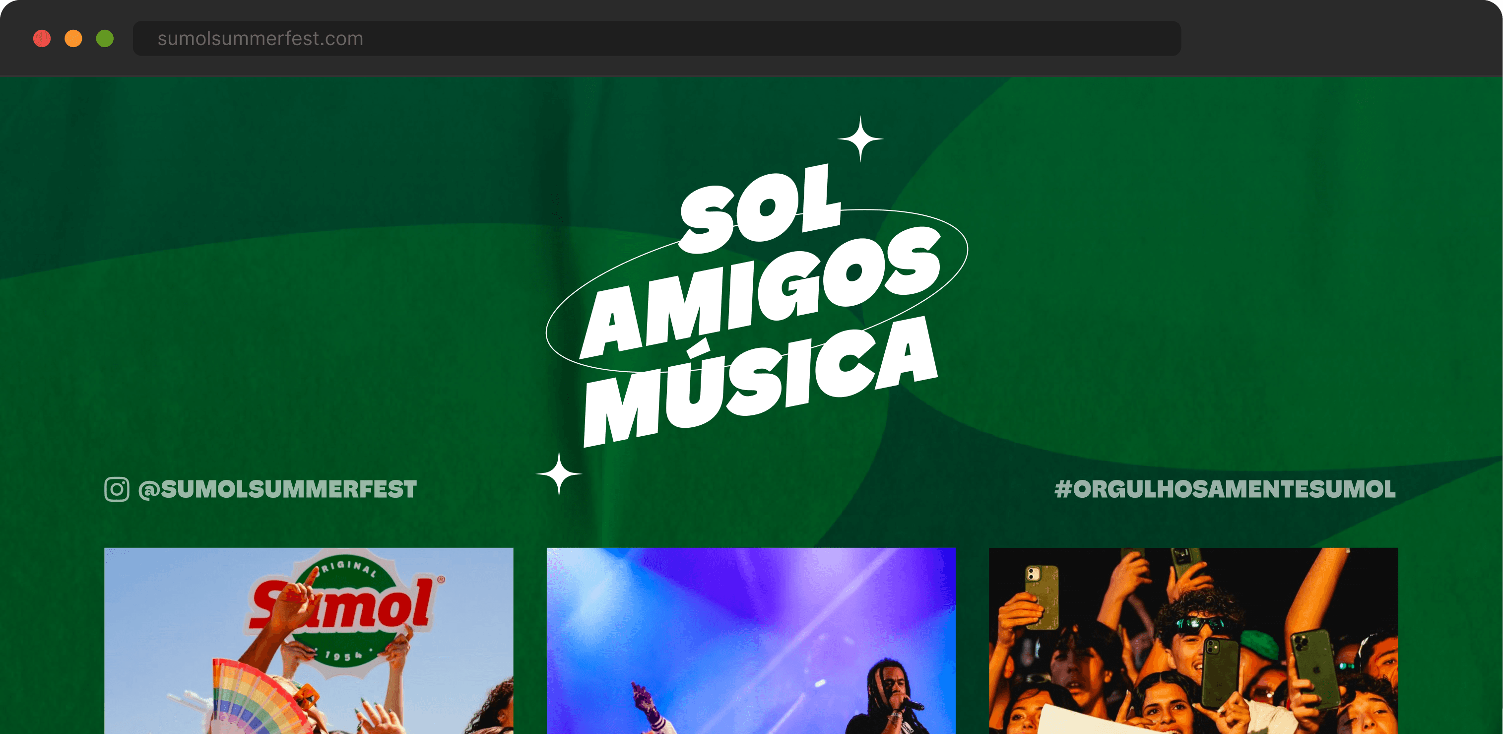 A photo grid with the claim "Sol Amigos Música", the handle @sumolsummerfest and the hashtag #orgulhosamentesumol. Concert, crowd and behind-the-scenes imagery that communicates the energy of the event better than any copy could.