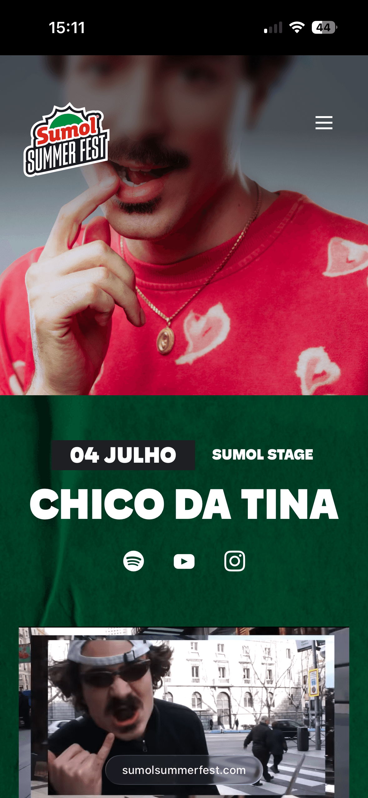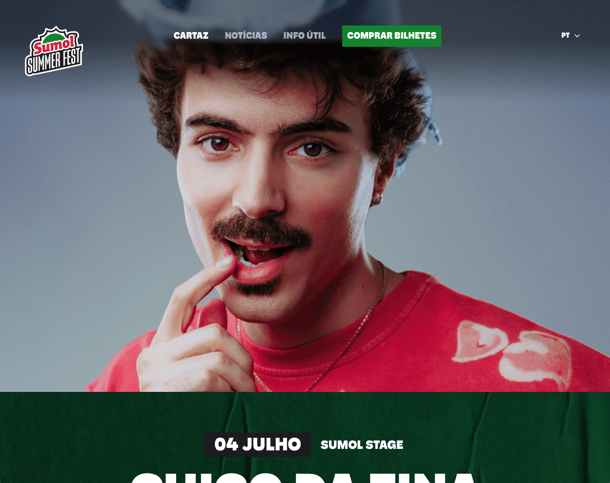 A full redesign of the Sumol Summer Fest website, covering the homepage, individual artist pages, and a mobile-first experience across all breakpoints. The site went live ahead of the full lineup announcement, with the first confirmed artists already live.
