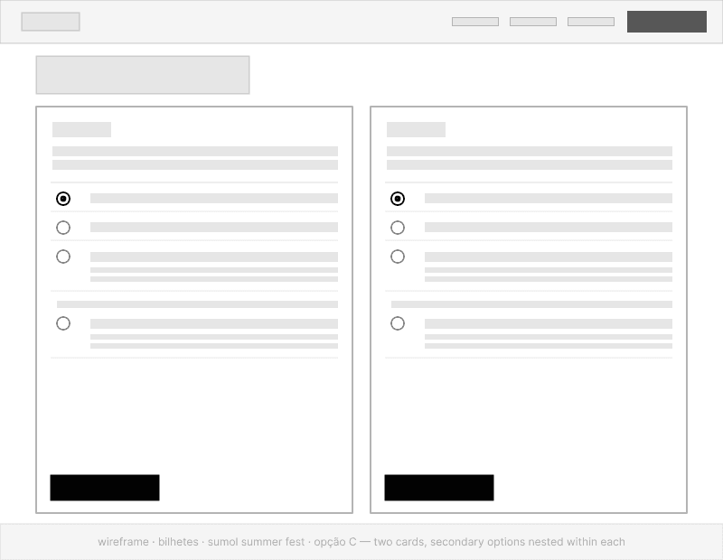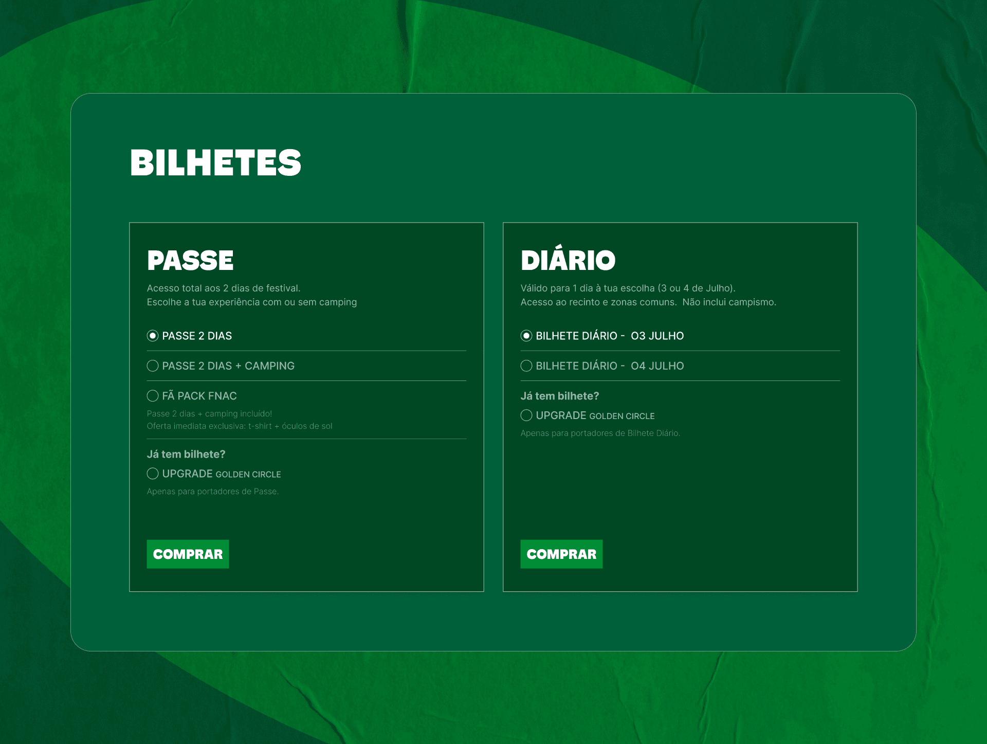 The primary decision is simple: am I going for both days or just one? The cards separate that choice immediately. Secondary options (camping, Fã Pack FNAC, Golden Circle upgrade) appear within each card without cluttering the initial decision.