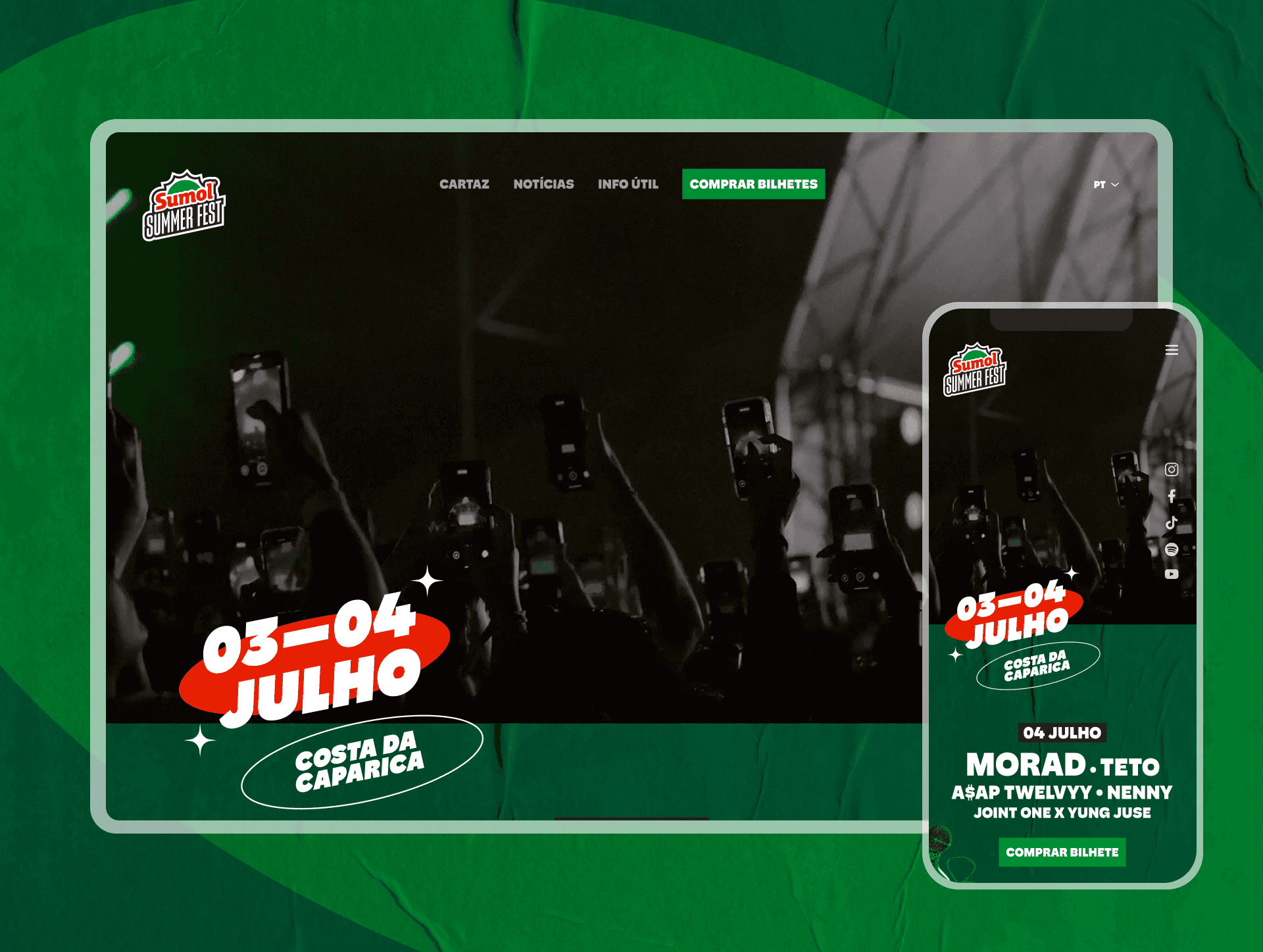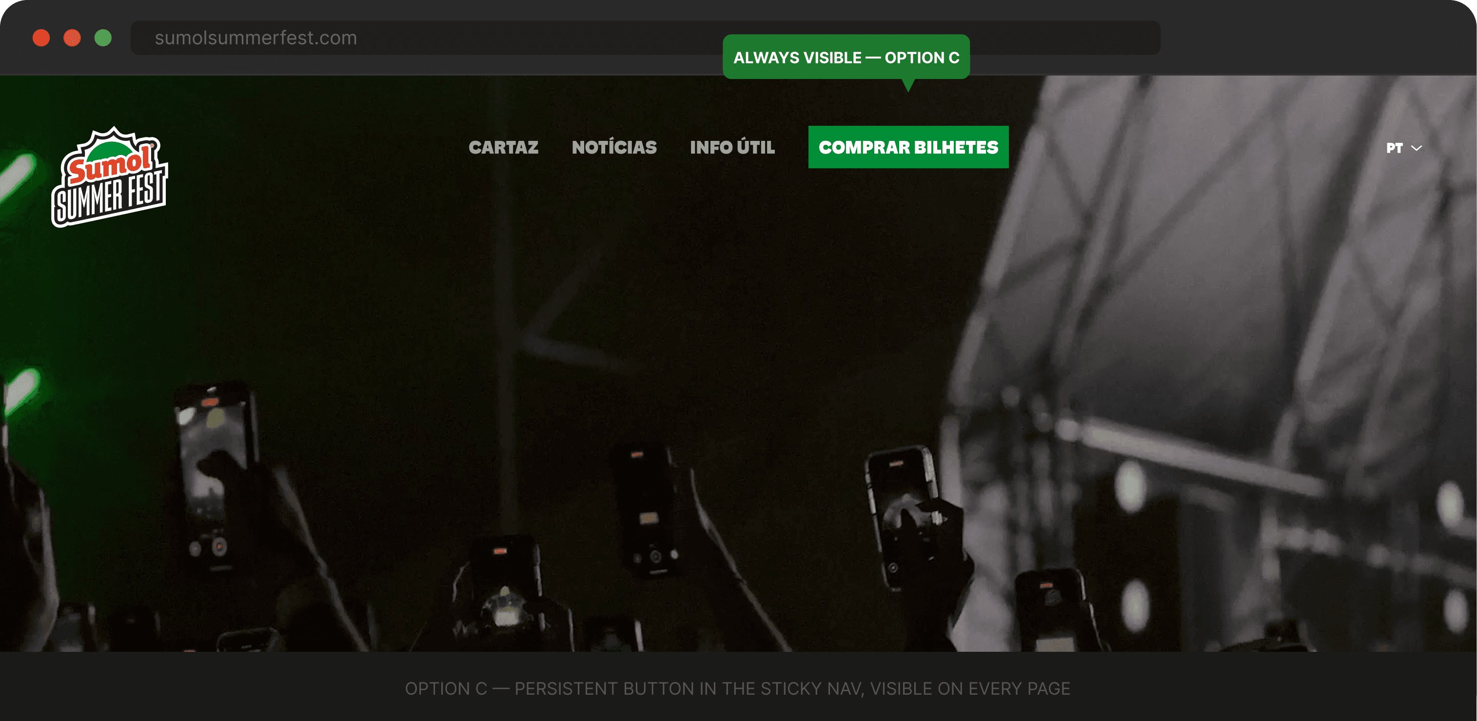 The green "Comprar Bilhetes" button became a permanent anchor point across the entire site. Visually distinct from the rest of the nav — impossible to miss without being intrusive.