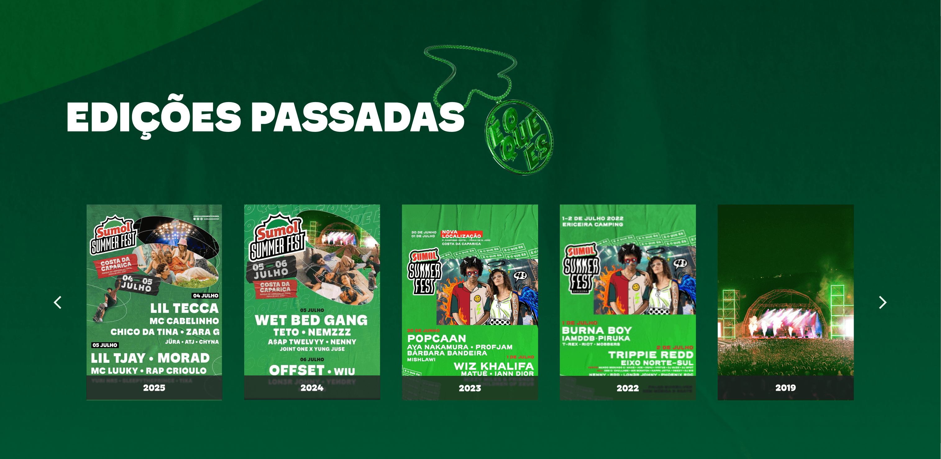 Horizontal scroll keeps the user on the page without the feeling of browsing an archive. The posters speak for themselves: lineup, year and visual identity of each edition, reinforcing the festival's credibility and longevity.